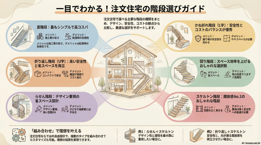今回は、注文住宅で選べる階段の代表的な種類と、それぞれの特徴・メリット・注意点をわかりやすくまとめました!